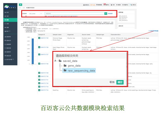 1)下載大豆RNA-seq公共數(shù)據(jù)集: 數(shù)據(jù)集1 SRA數(shù)據(jù)庫編號:PRJNA140081. 包含14個樣本,其中11個樣本為生殖組織來 源(花、豆莢、種子),3個為營養(yǎng)組織來源(葉、根、根瘤) 數(shù)據(jù)集2 GEO數(shù)據(jù)庫編號: GSE29163. 包含10個樣本,其中6個樣本為生殖組織來源(花、花芽、種子),4個樣本為營養(yǎng)組織來源(根、莖、葉、幼苗) 該步驟可進入BMKCloud_數(shù)據(jù)庫模塊按數(shù)據(jù)編號完成數(shù)據(jù)檢索及一鍵保存,保存后的數(shù)據(jù)可直接調(diào)用百邁云平臺的分析模塊BMKCloud_APP進行后續(xù)分析。