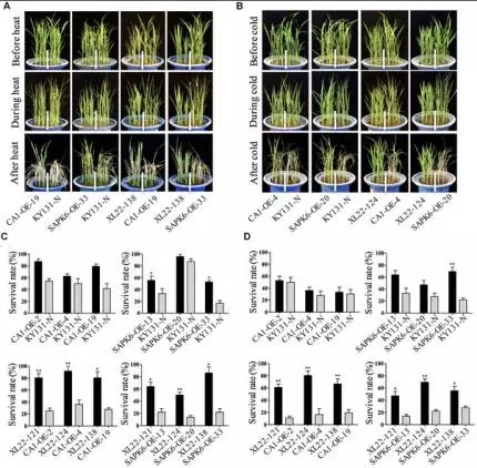 分別取XL22、CA1-OE、SAPK6-OE、KY-131-N的4葉齡種子材料,每個3個生物學重復,均進行42℃ 12小時,4℃5天處理,最后正常環(huán)境下生長7天,觀察這各材料之間的葉卷曲清苦以及存活率,結(jié)果顯示,XL22表現(xiàn)為個更高的存活率(圖5C),更加輕微的葉片卷曲(圖4A),表明XL22相較于單基因轉(zhuǎn)化株與非轉(zhuǎn)基因株擁有更強的耐熱、抗寒能力。
