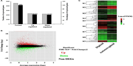 40927個(gè)基因中,4601個(gè)基因是差異表達(dá)的(圖3A),2343個(gè)上調(diào),2259個(gè)下調(diào)(圖3B),兩組間DEGs占比較少((11.24%)。隨機(jī)挑選DEGs進(jìn)行層次聚類,分析表達(dá)模式(圖3C),發(fā)現(xiàn)四倍體中K1、K3、K6、K9類別下調(diào),K2、K4、K5、K7,K8類別顯著上調(diào)。