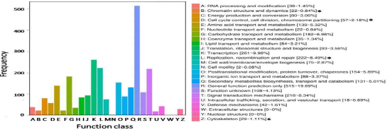 COG分類中,2615個(gè)DEGs可歸到25個(gè)COG類別(圖4),其中包含最多DEGs的類別為:復(fù)制重組與修復(fù)(222個(gè),8.49%),轉(zhuǎn)錄(261個(gè),9.98%),一般功能(515個(gè),19.69%),與KEGG結(jié)果一致。