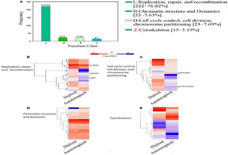 為闡述四倍體蕪菁減數(shù)分裂過程改變相關(guān)的遺傳信息,選擇以下明顯與減數(shù)分裂相關(guān)的COG類別進(jìn)行細(xì)分:(1)復(fù)制,重組和修復(fù);(2)染色質(zhì)結(jié)構(gòu)和動(dòng)力學(xué);(3)細(xì)胞周期控制,細(xì)胞分裂,染色體分區(qū);(4)細(xì)胞骨架。在4,601個(gè)位點(diǎn)中,共鑒定出288個(gè)與減數(shù)分裂相關(guān)的基因(圖7A)。