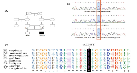 圖3?RAX突變鑒定(A.譜系遺傳;B.Sanger驗(yàn)證;C.RAX基因?Ile38?氨基酸殘基進(jìn)化保守性)