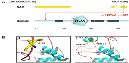 變異型分析的詳細(xì)過程(圖2A)。變體數(shù)據(jù)庫中排除次要等位基因頻率(MAF)>0.005的變異型。純合子分析顯示有12個大于2?Mb的純合子位點(diǎn)(圖2B)。在使用逐步篩選策略后,發(fā)現(xiàn)在純合子區(qū)域有3個候選變異型(RAX、TRPM5、PCDH17)。在家族成員中擴(kuò)大檢測后篩選得到一個RAX錯義突變(c.113?T>?C,p.I38T)。且在dbSNP137、1000 Genome、ESP6500、內(nèi)部數(shù)據(jù)庫、ExAC數(shù)據(jù)庫中沒有此錯義突變(圖3A-B)。