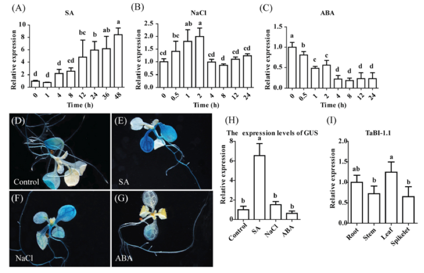 研究者創(chuàng)建了含有1.7kb TaBI-1.1啟動子并生成轉基因擬南芥的PBI :: GUS融合構建體,以研究TaBI-1.1的空間表達模式。使用GUS染色測定組織GUS活性。在成熟葉和根中有TaBI-1.1表達,但在下胚軸和幼葉中觀察不到(圖1D)。還檢測了各種小麥組織中的TaBI-1.1表達水平,包括根,莖,葉和小穗,結果表明TaBI-1.1的表達在這些小麥組織中普遍存在,而且在葉中最高,在小穗中最低(圖1I)。在SA和NaCl處理之后,成熟葉中的表達與對照相比增加,并且SA處理的表達更高。當SA和NaCl處理時,在下胚軸中也檢測到表達(圖1E,F(xiàn))。在ABA處理的植物的葉子中檢測到較弱的表達(圖1G)。通過qRT-PCR進一步證實GUS表達水平(圖1H)。以上結果表明,TaBI-1.1在各種脅迫下均有表達。