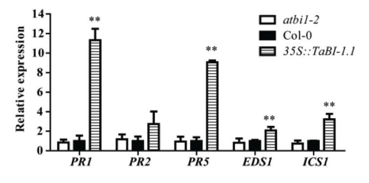 PR基因表達與SA積累和系統(tǒng)獲得性抗性(SAR)有關。進一步檢測了常規(guī)條件下生長2周齡Col-0,atbi1-2和35S :: TaBI-1.1#1幼苗中SA相關基因的表達。與Col-0和atbi1-2相比,在35S :: TaBI-1.1中觀察到PR1,PR5,ICS1和EDS1有顯著高表達水平。 然而,在這些基因表達水平中Col-0和atbi1-2之間沒有檢測到顯著差異(圖3)。 與Col-0相比,35S :: TaBI-1.1中PR1和PR5的表達水平分別增加了約11倍和9倍。 PR2,ICS1和EDS1表達的倍數(shù)變化低于PR1和PR5表達的變化(圖3)。因此,TaBI-1.1上調PR1,PR2,PR5,ICS1和EDS1基因的表達,表明 TaBI-1.1在SA信號傳導中起正向調節(jié)作用。