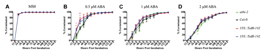 研究者進一步研究了TaBI-1.1在發(fā)芽過程中對ABA的敏感性。 在不同濃度的ABA的培養(yǎng)基上每12小時記錄發(fā)芽種子的百分比。在MS0培養(yǎng)基中,Col-0,atbi1-2和35S :: TaBI-1.1轉基因擬南芥植物顯示相似的發(fā)芽率(圖5A)。 含有0.5μMABA的培養(yǎng)基中,兩種轉基因株系萌發(fā)顯著快于Col-0和atbi1-2(圖5B)。 在含有1μMABA的培養(yǎng)基上觀察不到顯著差異(圖5C)。 在含有2μMABA的培養(yǎng)基上,Col-0和兩種轉基因品系也比atbi1-2稍快地萌發(fā)(圖5D)。 以上結果表明,TaBI-1.1轉基因擬南芥對ABA的敏感性較低。