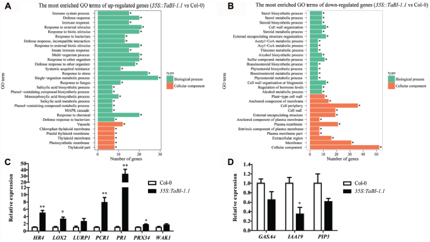 研究人員對35S :: TaBI-1.1#1和Col-0植物進行了RNA-seq分析,以更好地理解TaBI-1.1功能。鑒定出48個上調基因和58個下調基因并做了一個熱圖。使用GO分析將差異表達的基因功能分類。富集了30多個GO terms,如圖6所示。對于上調的基因,富集的GO terms主要集中在抗生物脅迫,細胞免疫應答和SA合成與代謝相關的生物過程上。前10個關鍵的Go terms分別是防御反應、對外部刺激的反應、對生物刺激的反應、對外部生物刺激的反應、多生物體過程、對另一個生物體的反應、對另一個生物體的防御反應、對壓力的反應、單一生物體代謝過程和對化學物質的反應(圖6A)。對于下調的基因,富集的GO terms集中在細胞組分上,并且前三項是細胞組分,膜和細胞周圍(圖6B)。選擇七個上調基因和三個下調基因進行qRT-PCR實驗,結果表明,qRT-PCR結果與RNA-seq分析一致。