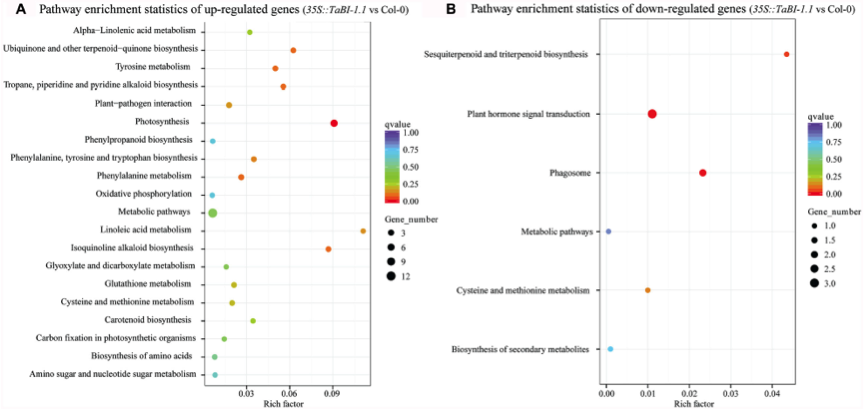 KEGG富集分析差異表達基因被呈現(xiàn)為散點圖。 使用富集因子、q值和通路中富集的基因數(shù)量來測量富集程度。 富集因子越高表示富集程度越高。觀察到上調基因富集了20多個KEGG通路。上調基因的前20個富集通路中,其中光合作用是最明顯的富集途徑(圖7A)。 光合作用的富集因子達到0.09,而q值大約為0。相反,下調基因的KEGG富集通路并不明顯,只有6個富集因子較低的通路被鑒定出來(圖7B)。因此,TaBI-1.1參與對生物脅迫的應答并主要通過基因上調表達來執(zhí)行其防御功能。
