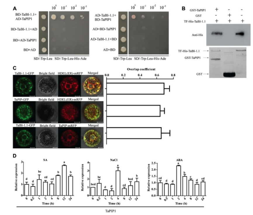 AtBI-1定位于ER膜上,研究者在小麥原生質體中檢測了TaBI-1.1-GFP和mRFP-HDEL的共定位以確定TaBI-1.1的亞細胞定位。GFP和mRFP熒光的重疊系數(shù) 是0.69,表明TaBI-1.1與ER膜上的HDEL共定位(圖8C)。 鑒于TaBI-1.1和TaPIP1之間的相互作用,研究者還檢測到TaPIP1-GFP和mRFP-HDEL之間的共定位以及TaBI-1.1-GFP和TaPIP1-mRFP在小麥原生質體中的共定位(圖8C)。 結果顯示TaBI-1.1和TaPIP1共定位于ER膜。