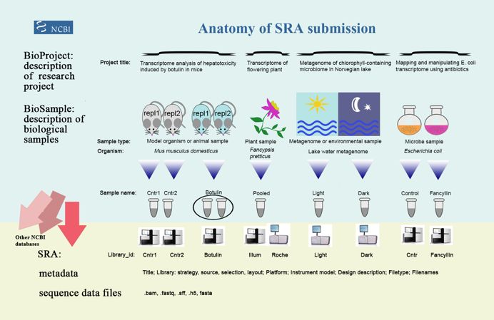 有過數(shù)據(jù)上傳經(jīng)歷的童鞋應(yīng)該對SRA并不陌生,上傳數(shù)據(jù)前我們一般要創(chuàng)建BioProject、BioSample,用于詳細說明項目信息、樣品信息;并通過SRA的Experiment、RUN描述建庫測序相關(guān)信息,如建庫類型、測序儀器、單雙端等;下圖概括出了幾者之間的關(guān)系。