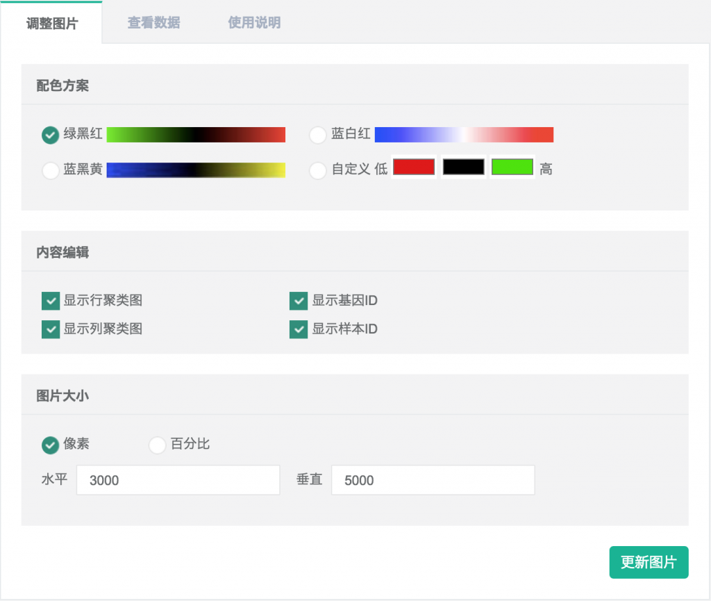 圖像編輯功能可實現(xiàn)熱圖顏色調(diào)整、樣本名修改、基因名修改、字體修改,同時支持png、pdf、svg不同尺寸圖片保存,方便大家在進行文章投稿過程或日常數(shù)據(jù)整理過程中對圖片的修改。