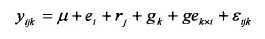 利用方差分析計算各性狀的環(huán)境方差、重復方差(有試驗重復)、遺傳方法、基因型與環(huán)境互作方差、誤差方差和遺傳力,并估計哥哥變量的遺傳效應。方差分析的線性模型為: